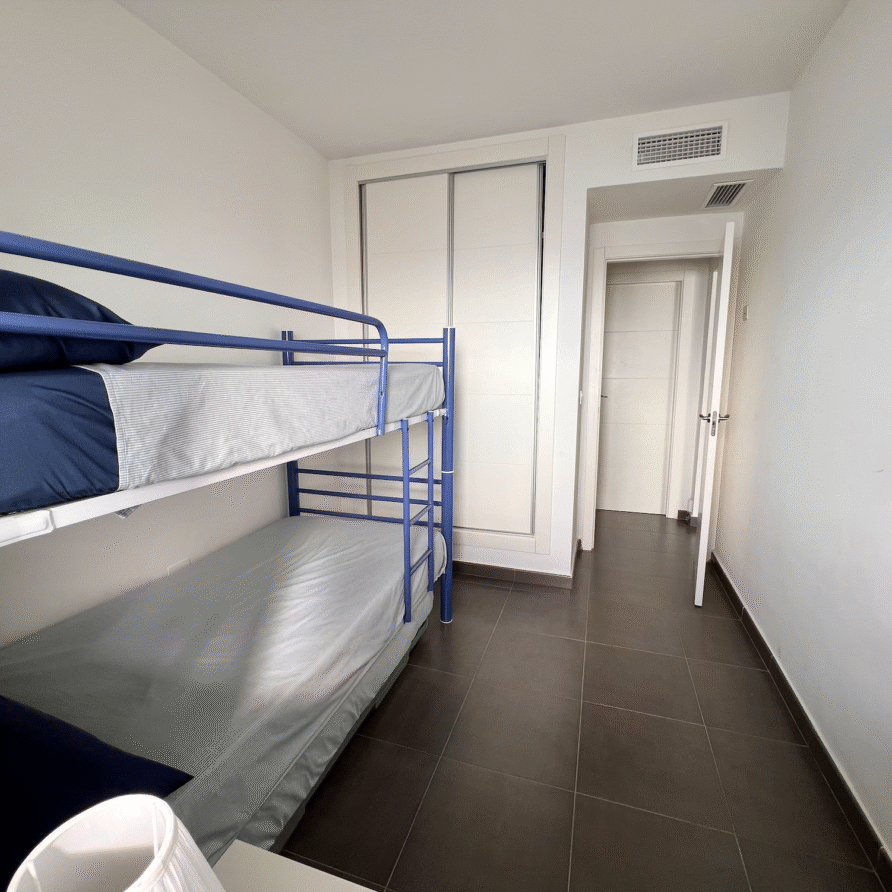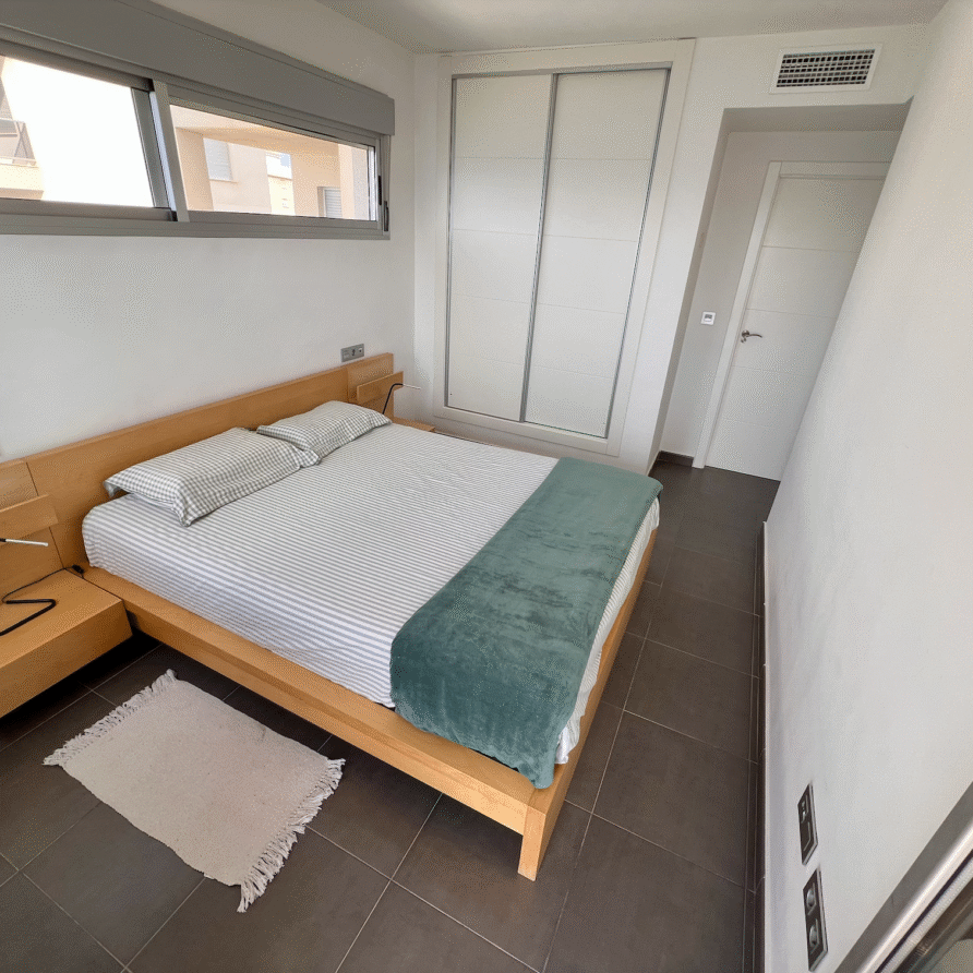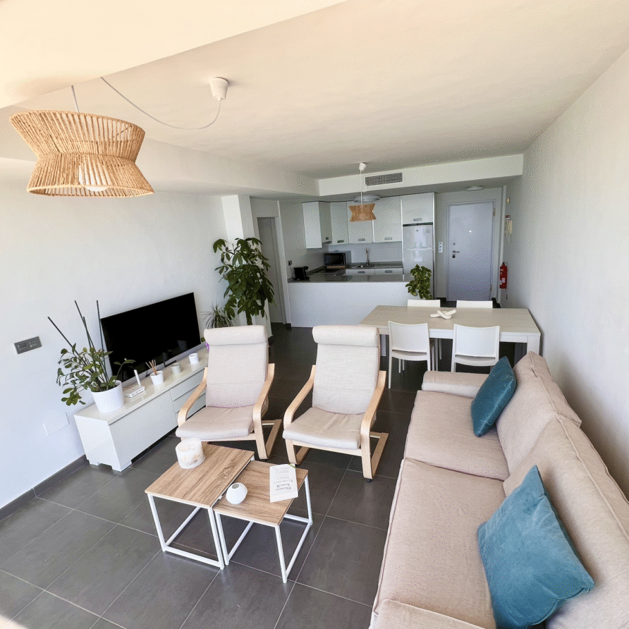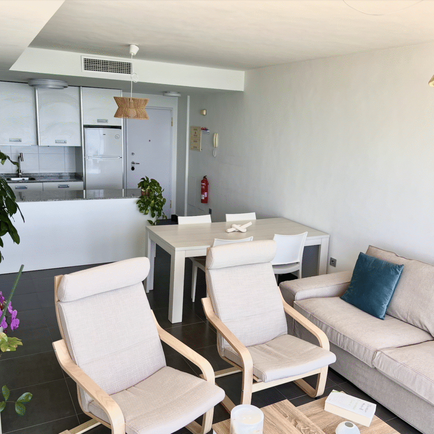 - Equipamiento: Aire acondicionado centralizado con bomba de calor en todo el apto, Cuna (bajo petición), Gel y champú, Muebles de terraza y toldo, Plancha de ropa, Sábanas y edredones nórdicos, Secador de pelo, Smart TV Pantalla Plana, Trona (bajo petición), Wifi y fibra con router de 1 Gb