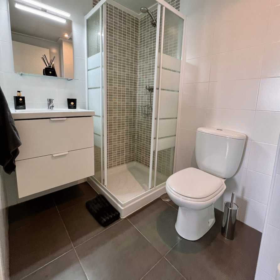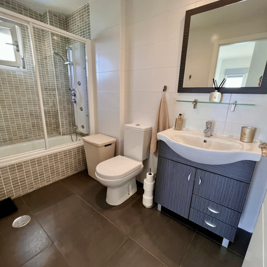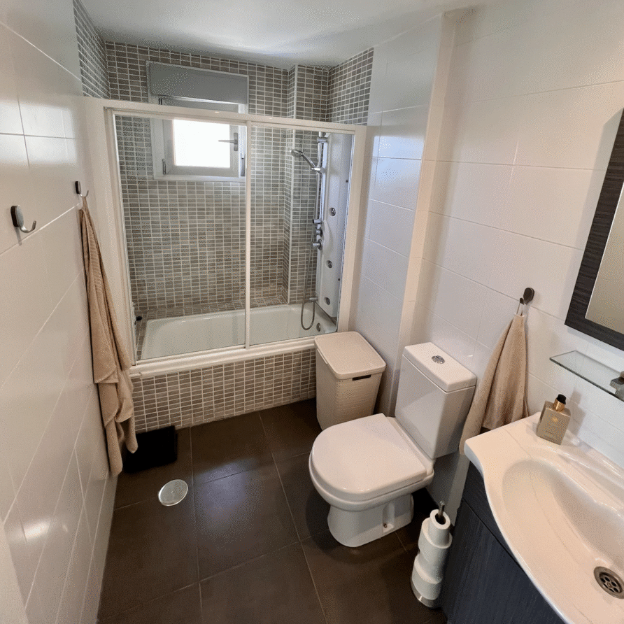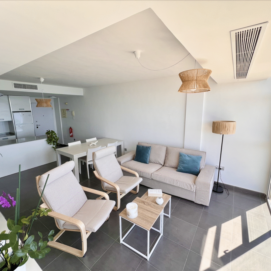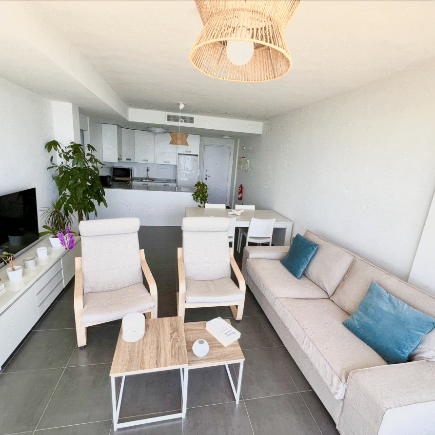 - Equipamiento: Aire acondicionado centralizado con bomba de calor en todo el apto, Cuna (bajo petición), Gel y champú, Muebles de terraza y toldo, Plancha de ropa, Sábanas y edredones nórdicos, Secador de pelo, Smart TV Pantalla Plana, Trona (bajo petición), Wifi y fibra con router de 1 Gb